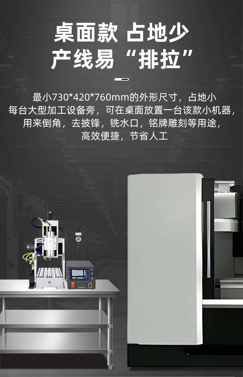 桌面款小型加工设备主打占地少、易排布、高效省人工,可置于大型设备旁协同作业,适用倒角、去披锋、铣水口等工序,支持铭牌雕刻等精细加工,高效便捷、节省人工成本。