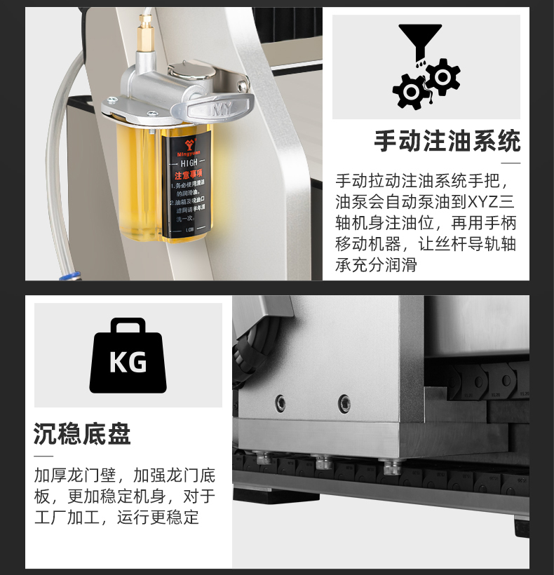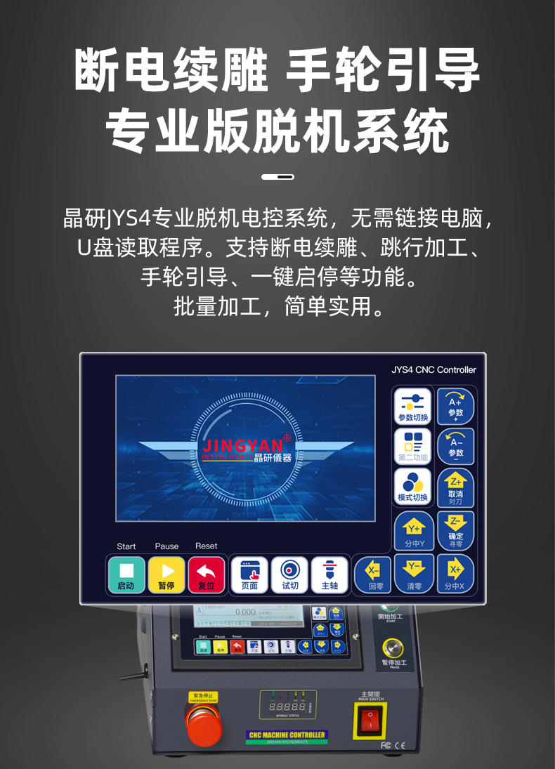 晶研方轨精雕机是一款高精度、高稳定性的数控雕刻设备,适用于多种材料和加工需求。它配备了工业级丝杆、直线导轨和雷赛闭环电机,确保了加工的精度和耐用性。此外,它还具有风琴防尘设计、手动注油系统、沉稳底盘和高柔拖链线,提高了机器的使用寿命和运行稳定性。该设备提供多种控制系统选择,包括JYS4脱机电控系统、伺服+JYS4专业版脱机系统和Mach3控制系统,以满足不同的生产需求。晶研方轨精雕机的桌面款设计使其占地面积小,适合在有限空间内使用,是一款适合工厂批量生产和自动化加工的高效设备。