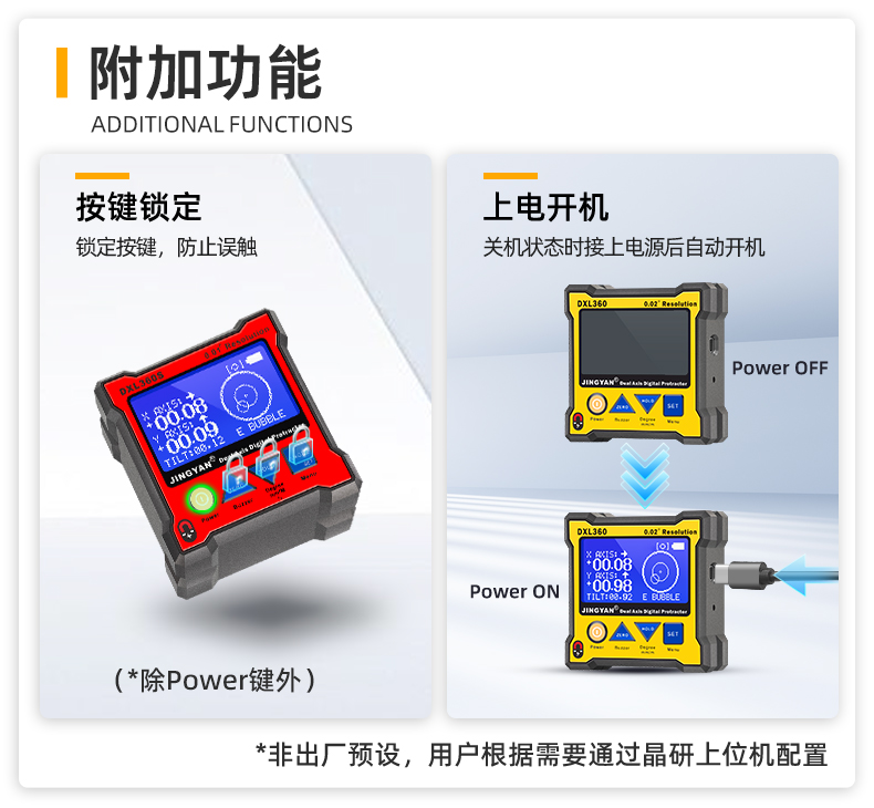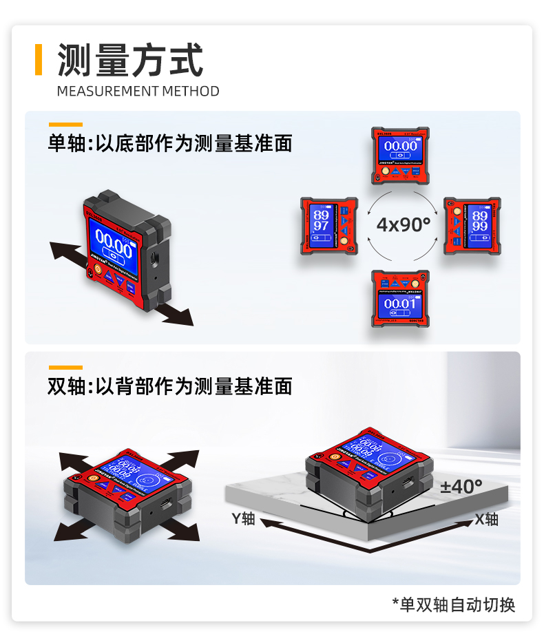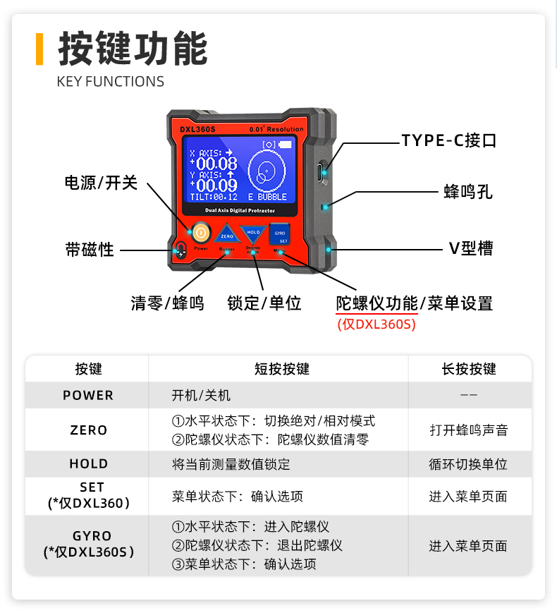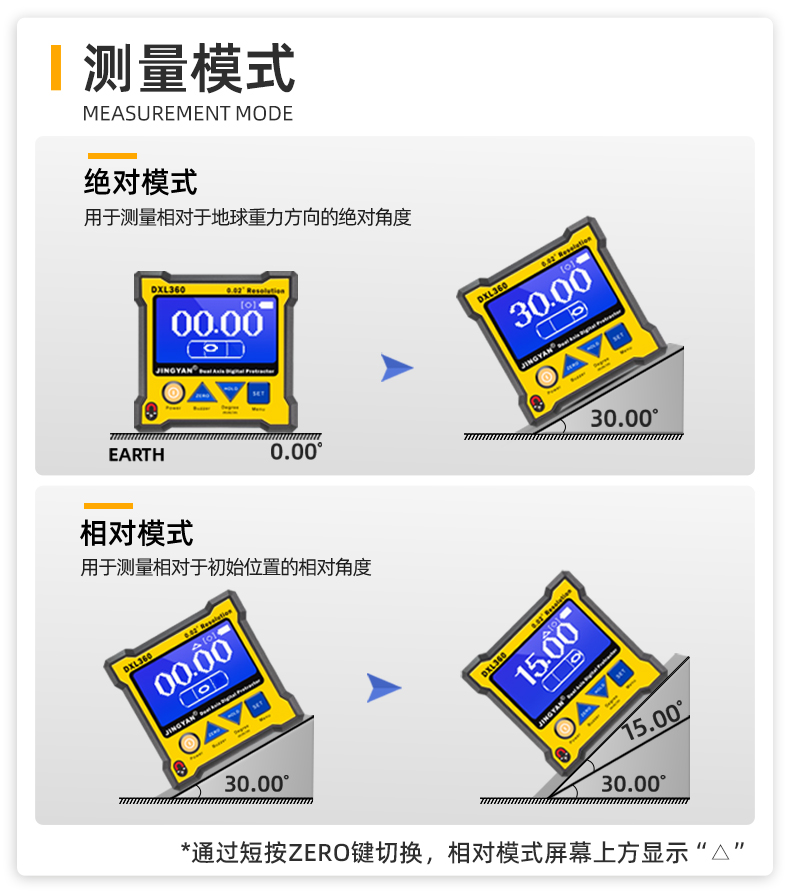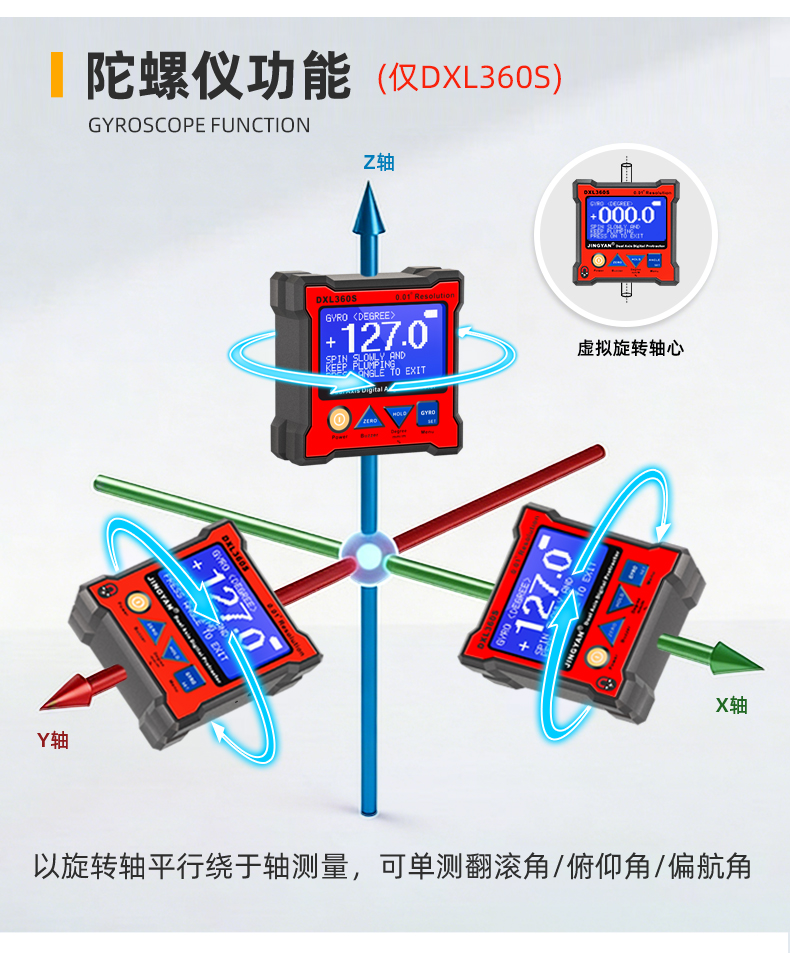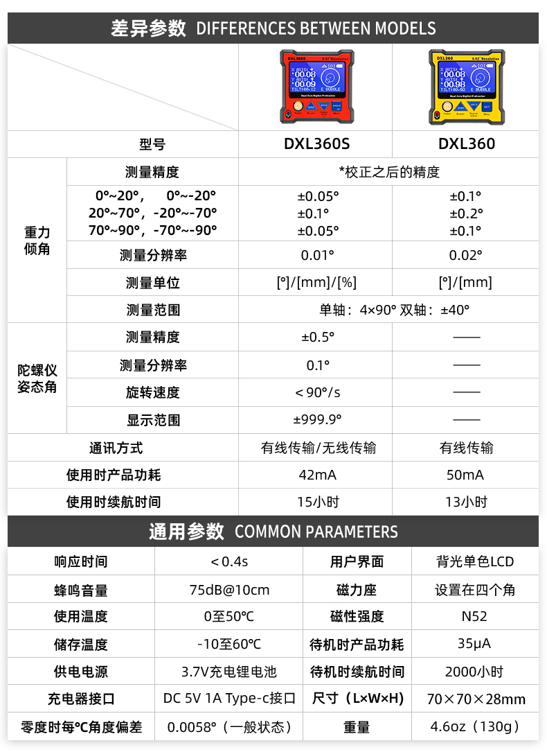 DXL360/S是一款专业测量水平和空间相对夹角(*DXL360S专有)的高精度数显倾角仪/水平仪,它基于微机电系统(MEMS)的先进技术,结合优化的补偿模型算法,保证倾角仪测量的稳定性和重复性。DXL360S精度高达0.05°,分辨率0.01°,可以采用3种测量单位显示(角度、毫米/米、斜率),特有的空间相对夹角功能(GYRO),可不受环境限制,测量任意平面之间相对夹角,陀螺仪测量精度±0.5°。DXL360实现最好精度0.1°,分辨率0.02°,可以采用2种测量单位显示(角度、毫米/米)。DXL360/S支持单轴4×90°,双轴±40°测量,底部和背部测量基准面有强磁性,V型凹槽设计便于放置在圆管上进行测量。双重数据存储功能,连接电脑或手机进行数据传输。DXL360/S广泛应用于机械制造、汽车维修、医疗行业、木材加工、通讯检测、家居装潢等用途。DXL360/S以其丰富的功能和实用性,广受全球客户青睐。