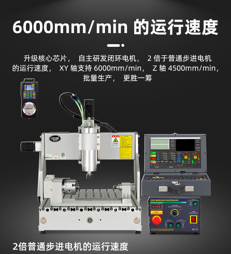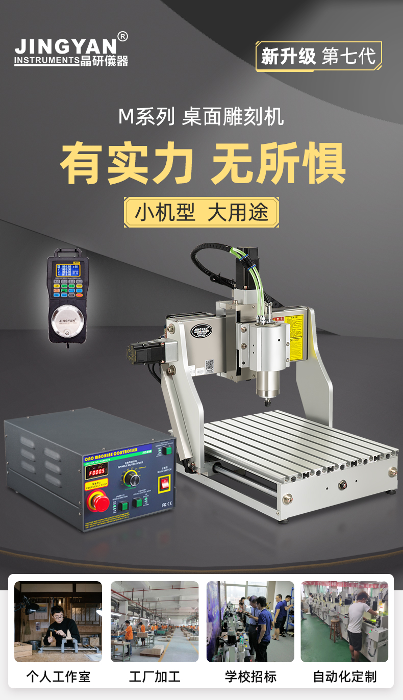 晶研M系列桌面雕刻机提供多种功率选择,适应不同硬度材料加工需求。其高精度编码限位系统、高速闭环电机和智能驱动卡,确保了加工的精度、速度和节能效果。此外,晶智牛云系统和手机小程序为用户提供了便捷的教学和售后服务,使其成为工业应用的理想选择。