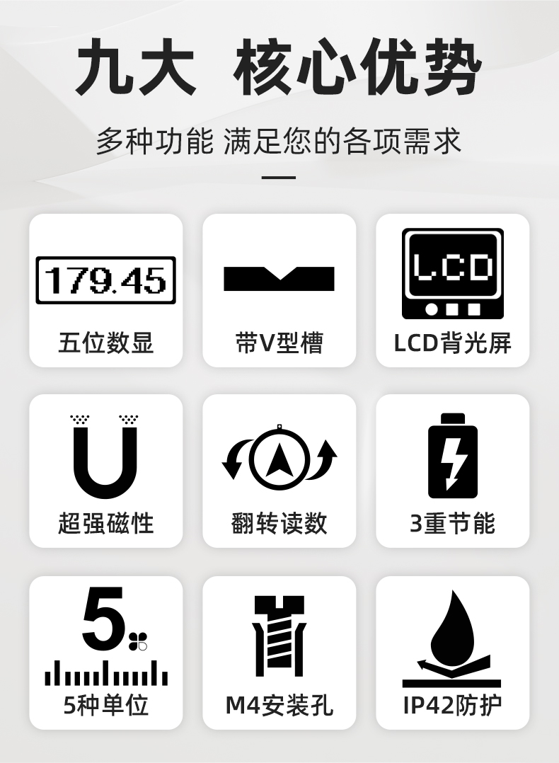 DXL180/C是一款可以使用多种单位显示的数字角度仪,支持单位为角度、斜率、英寸和毫米/米的读数。测量范围为2*0-180°和4*0-90°,仪器底部测量面具有强力磁性。V形凹槽设计便于放置在圆形管上进行测量。支持IP42等级防尘防水,背面预留M4螺丝孔,方便安装固定。DXL180/C广泛应用于木工切割、机械制造、装修设计、摄影爱好、产品检测等领域。