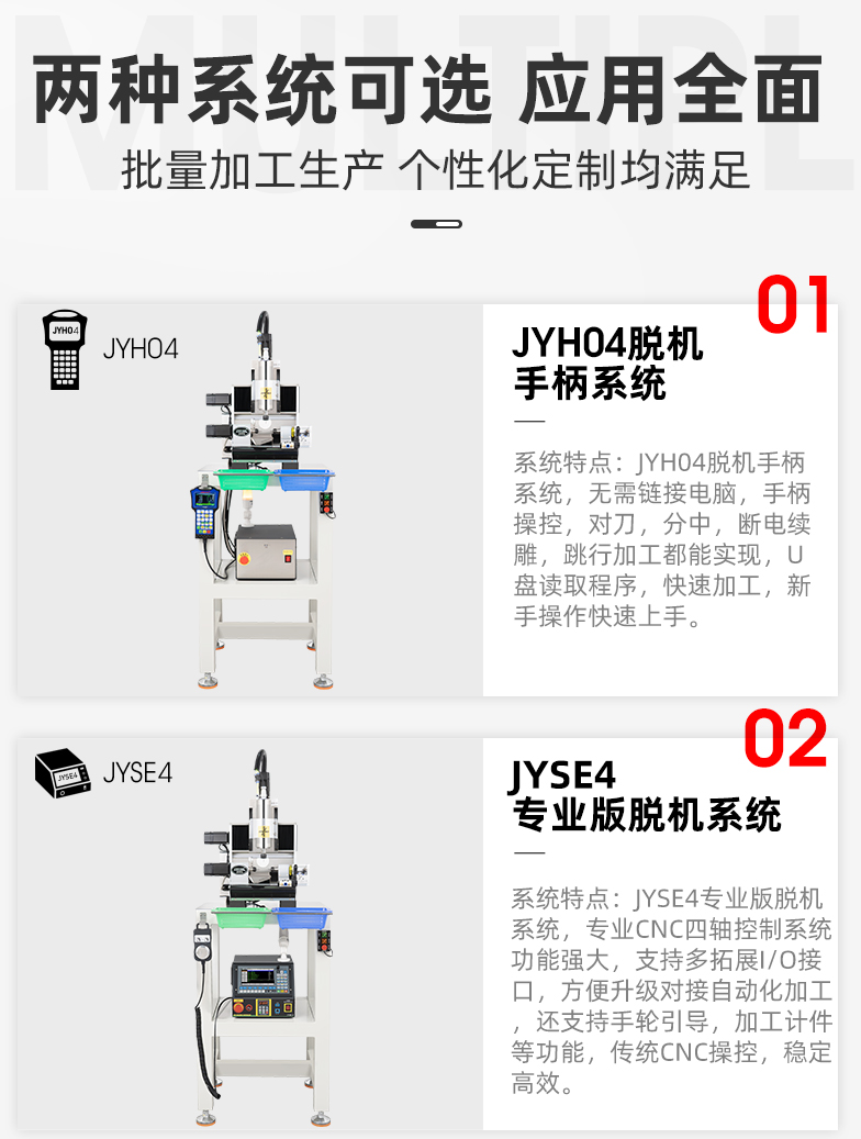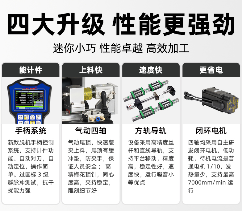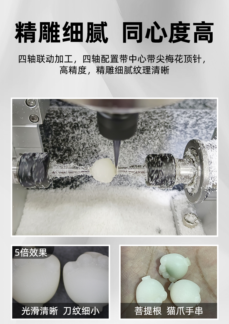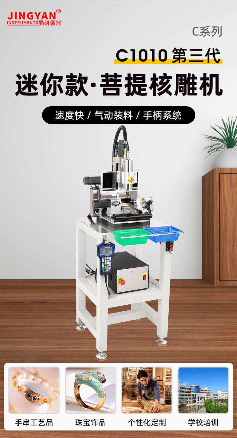 晶研仪器C1010第三代迷你款·菩提核雕机,专为手串工艺品和珠宝饰品设计。该设备具备两种系统选择:JYH04脱机手柄系统和JYSE4专业版脱机系统,满足不同加工需求。其九大核心特性包括专业系统、四轴联动、高速加工等,确保加工效率和精度。四大性能升级,如智能计件、快速上料、高速运行和节能省电,进一步提升操作便捷性和经济效益。设备适用于多种材料加工,如菩提手串、橄榄核雕等,是个性化定制和批量生产的理想选择。