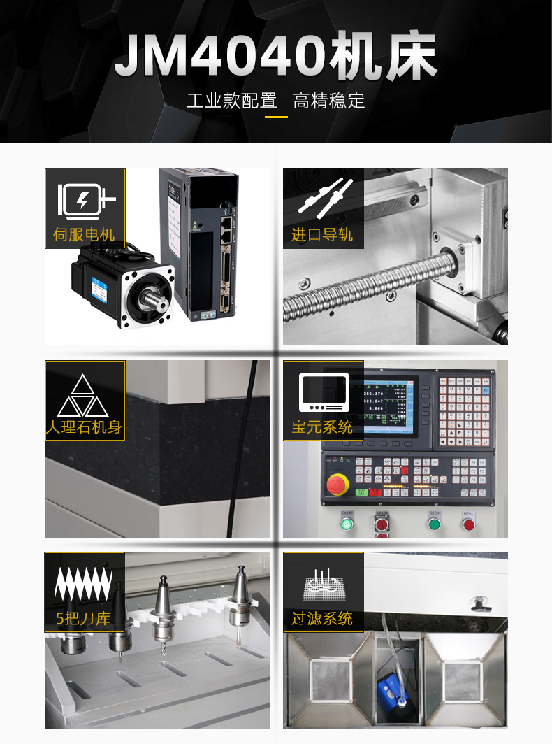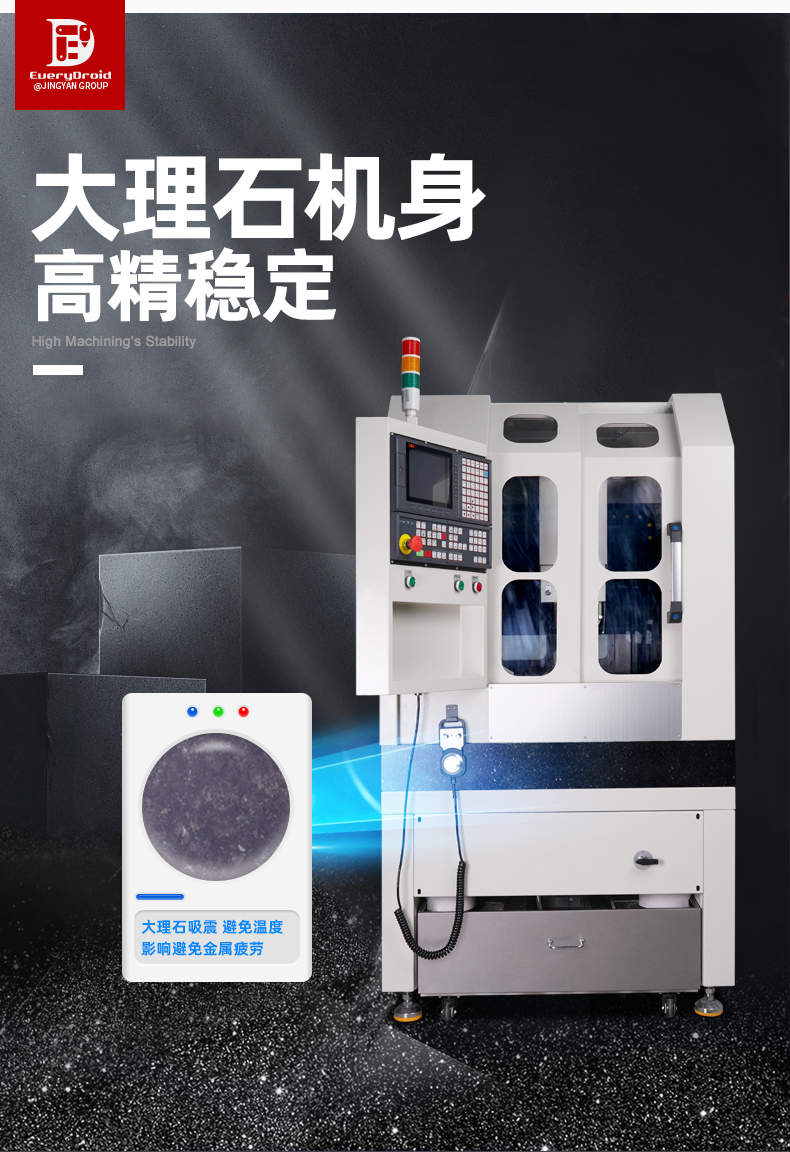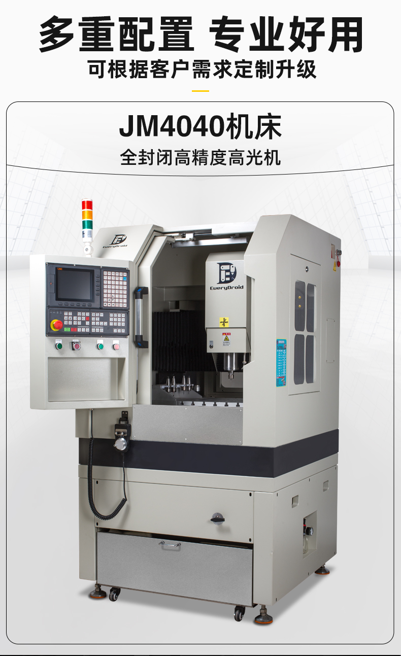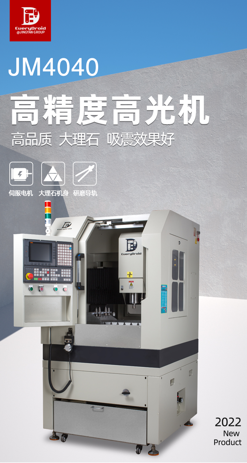 晶研JM4040高精度高光机,配备大理石机身与精密研磨丝杆,确保加工稳定性与精度。自动换刀与宝元控制系统实现高效智能操作。多层过滤系统保障设备持久运行。适用于铝合金、陶瓷、碳纤维等多种材料,满足精密零件加工需求,是制造业的精密之选。