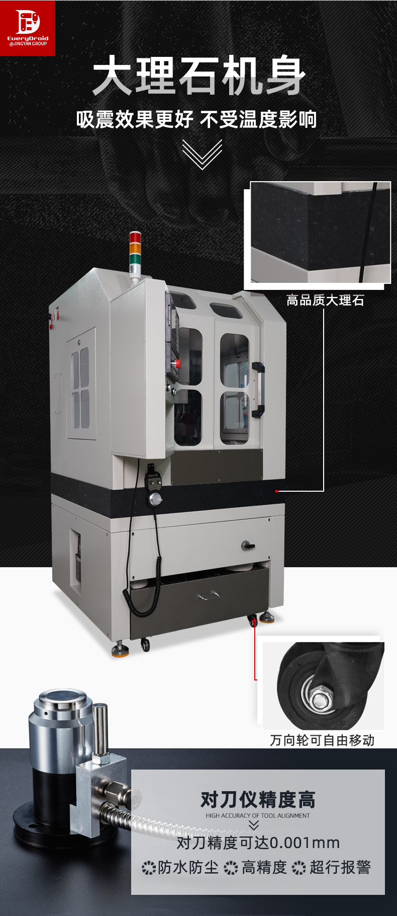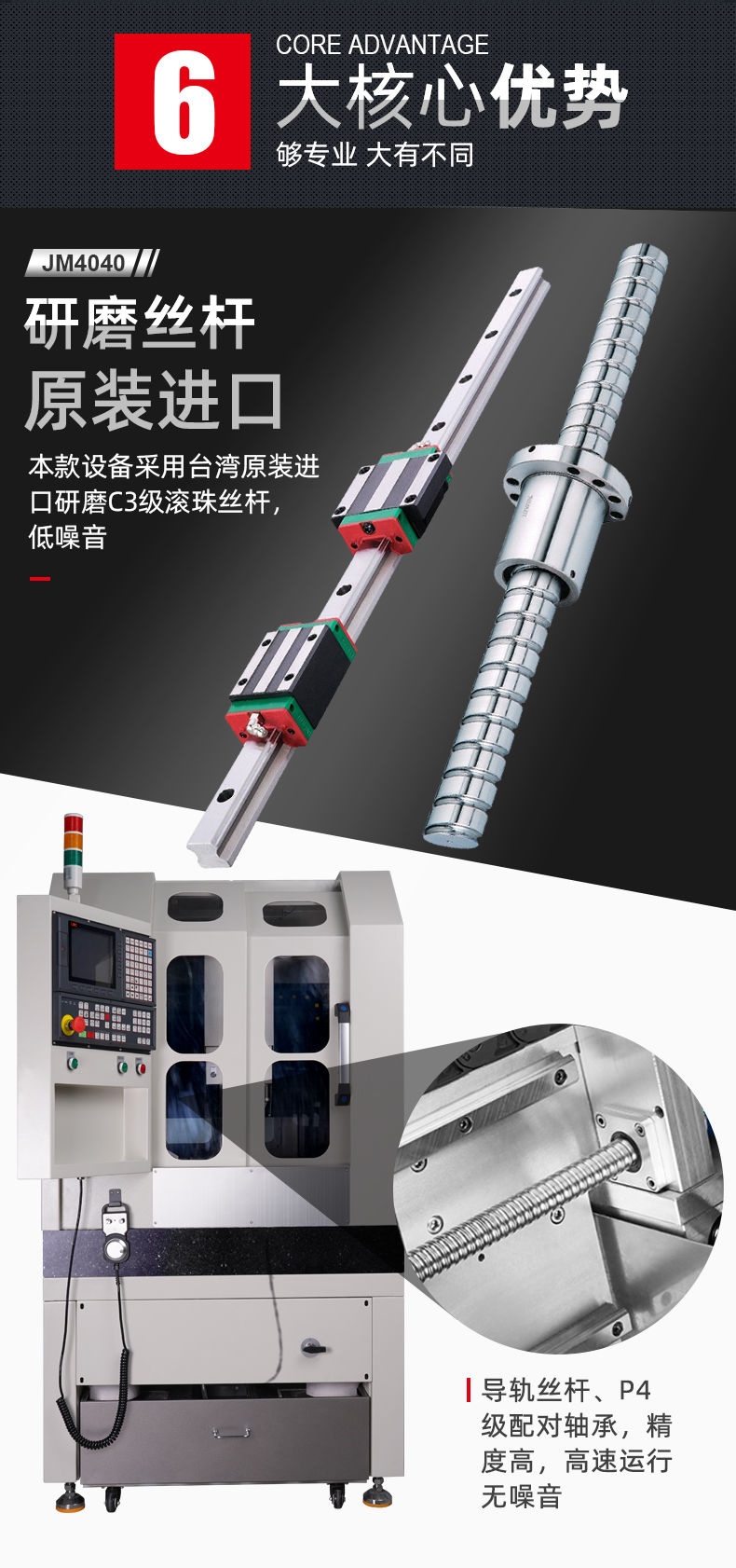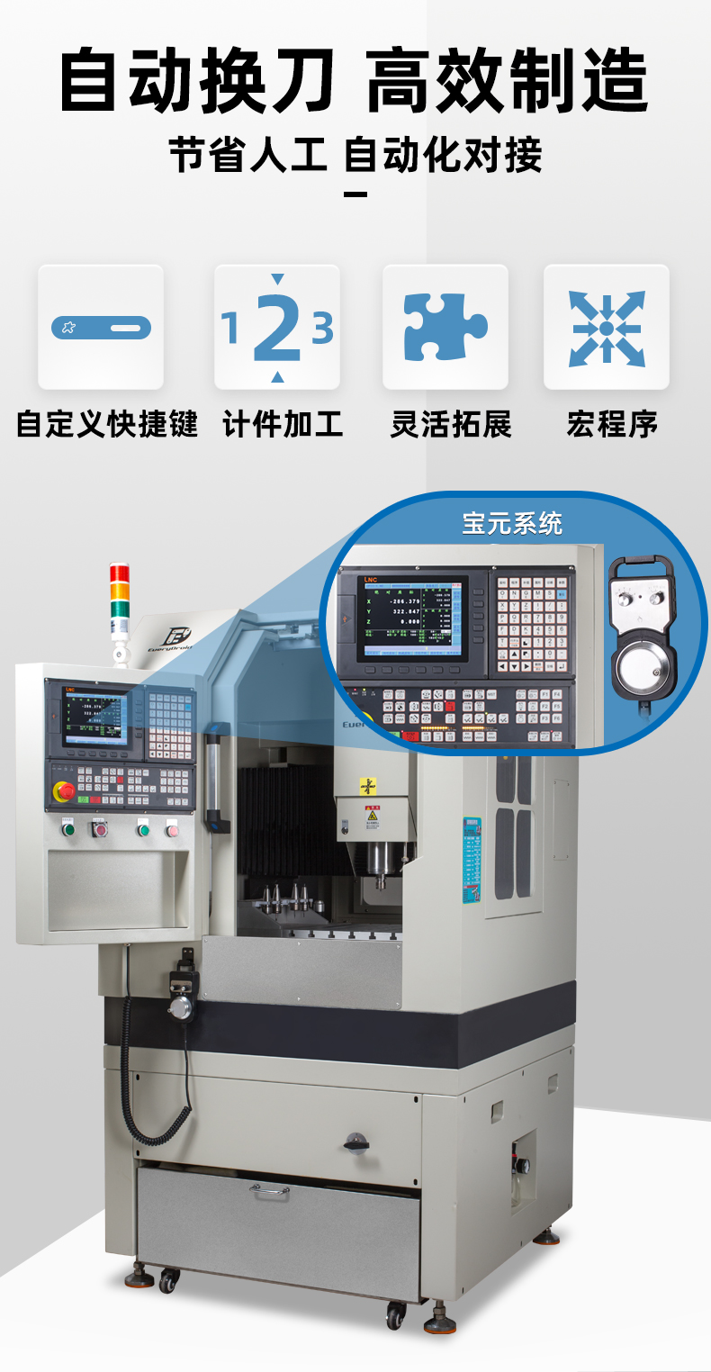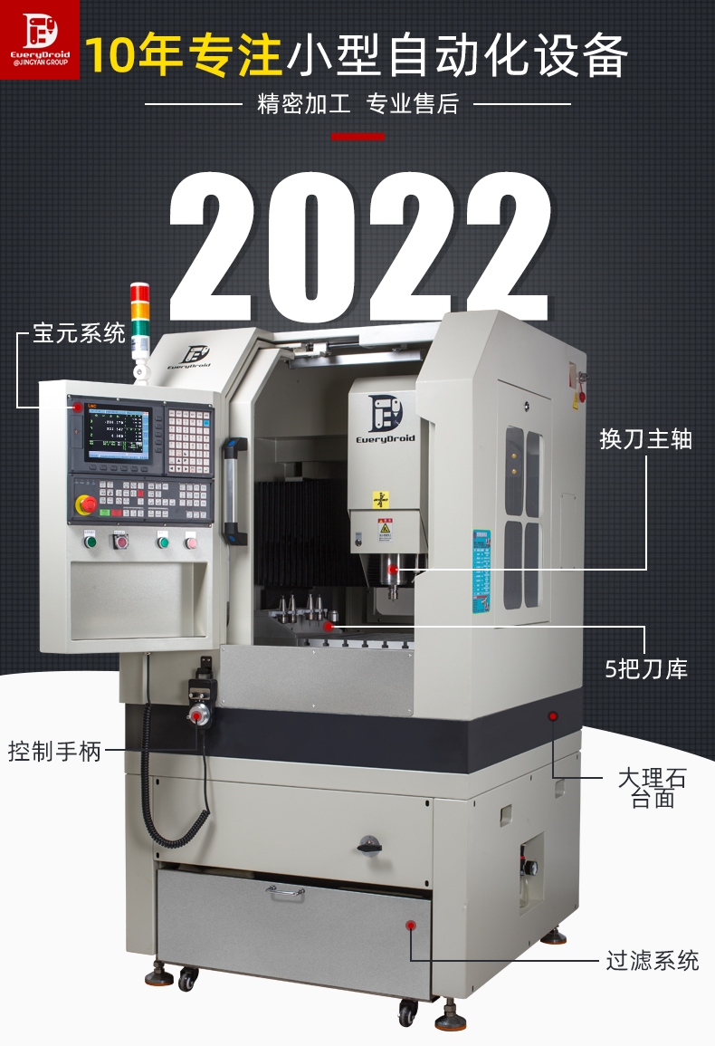 晶研JM4040高精度高光机,配备大理石机身与精密研磨丝杆,确保加工稳定性与精度。自动换刀与宝元控制系统实现高效智能操作。多层过滤系统保障设备持久运行。适用于铝合金、陶瓷、碳纤维等多种材料,满足精密零件加工需求,是制造业的精密之选。