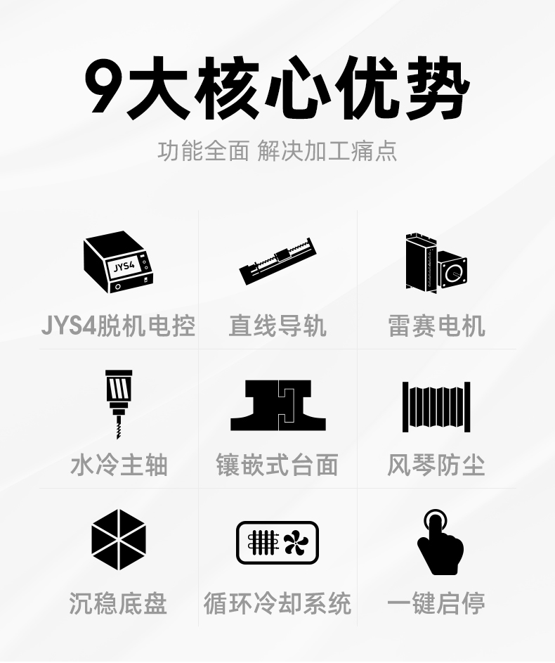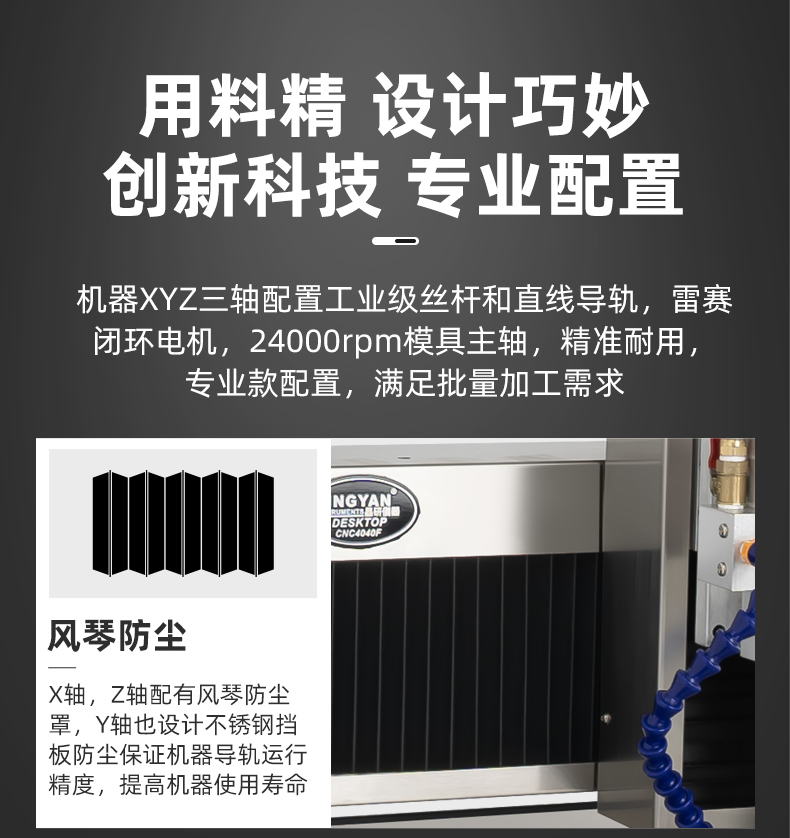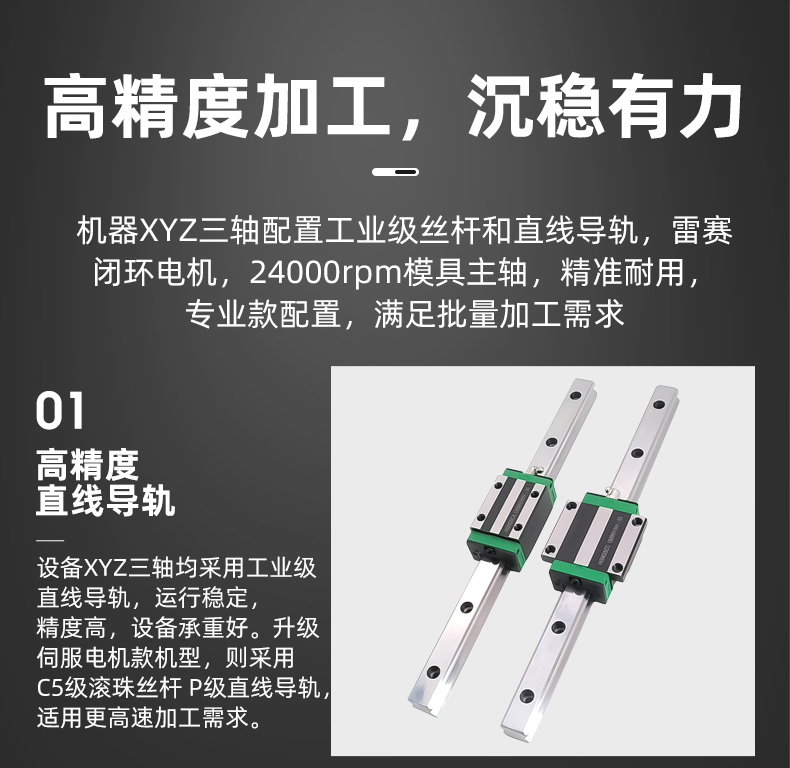 晶研方轨精雕机是一款高精度、高稳定性的数控雕刻设备,适用于多种材料和加工需求。它配备了工业级丝杆、直线导轨和雷赛闭环电机,确保了加工的精度和耐用性。此外,它还具有风琴防尘设计、手动注油系统、沉稳底盘和高柔拖链线,提高了机器的使用寿命和运行稳定性。该设备提供多种控制系统选择,包括JYS4脱机电控系统、伺服+JYS4专业版脱机系统和Mach3控制系统,以满足不同的生产需求。晶研方轨精雕机的桌面款设计使其占地面积小,适合在有限空间内使用,是一款适合工厂批量生产和自动化加工的高效设备。