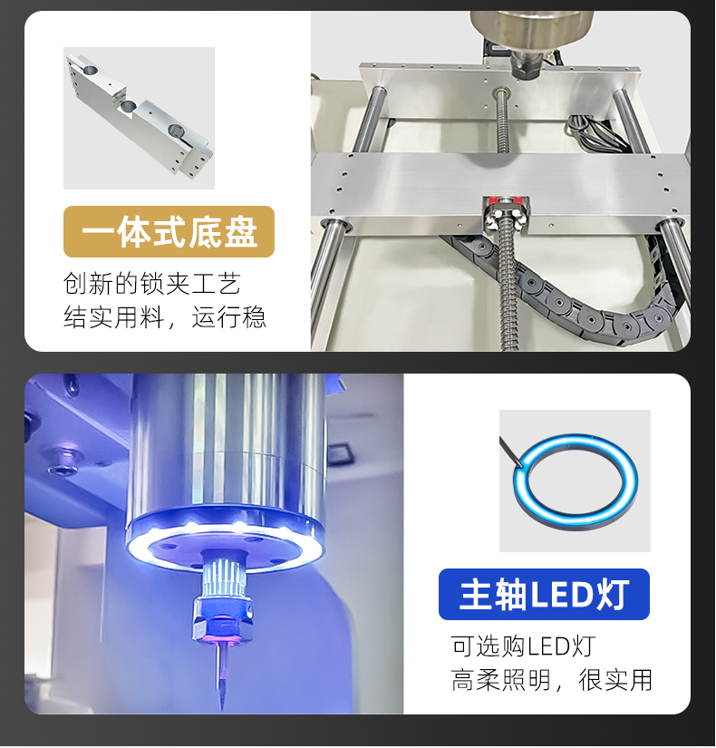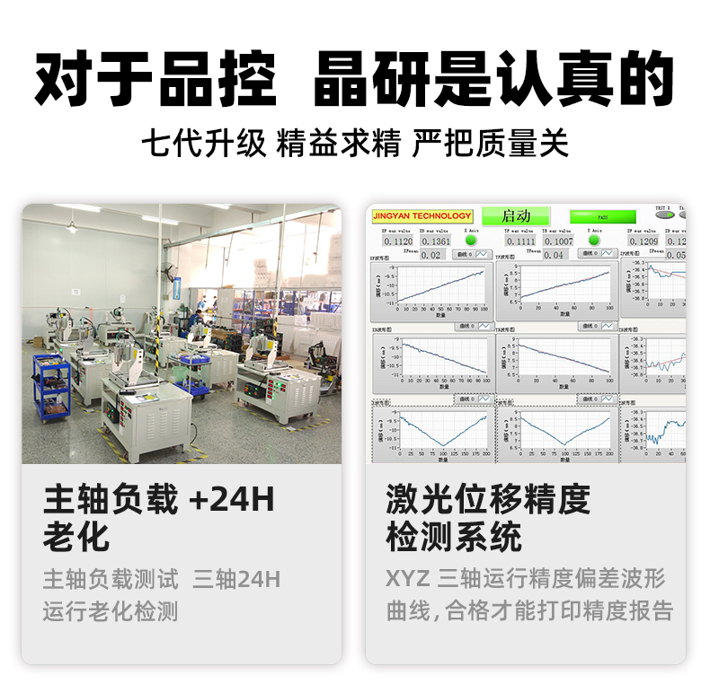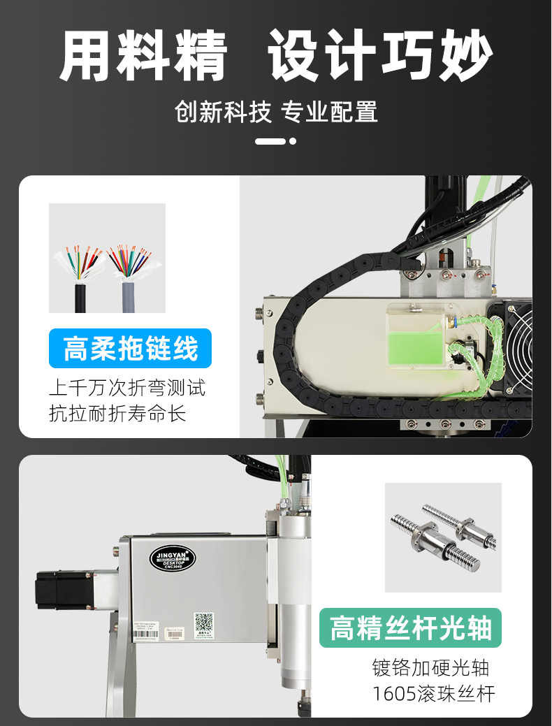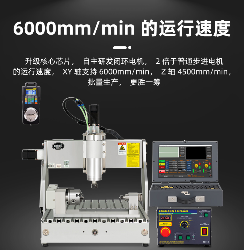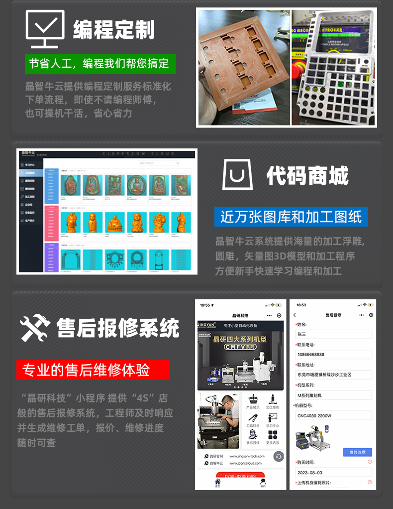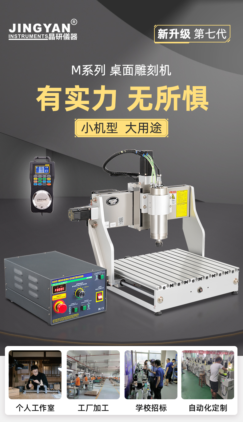 晶研M系列桌面雕刻机提供多种功率选择,适应不同硬度材料加工需求。其高精度编码限位系统、高速闭环电机和智能驱动卡,确保了加工的精度、速度和节能效果。此外,晶智牛云系统和手机小程序为用户提供了便捷的教学和售后服务,使其成为工业应用的理想选择。